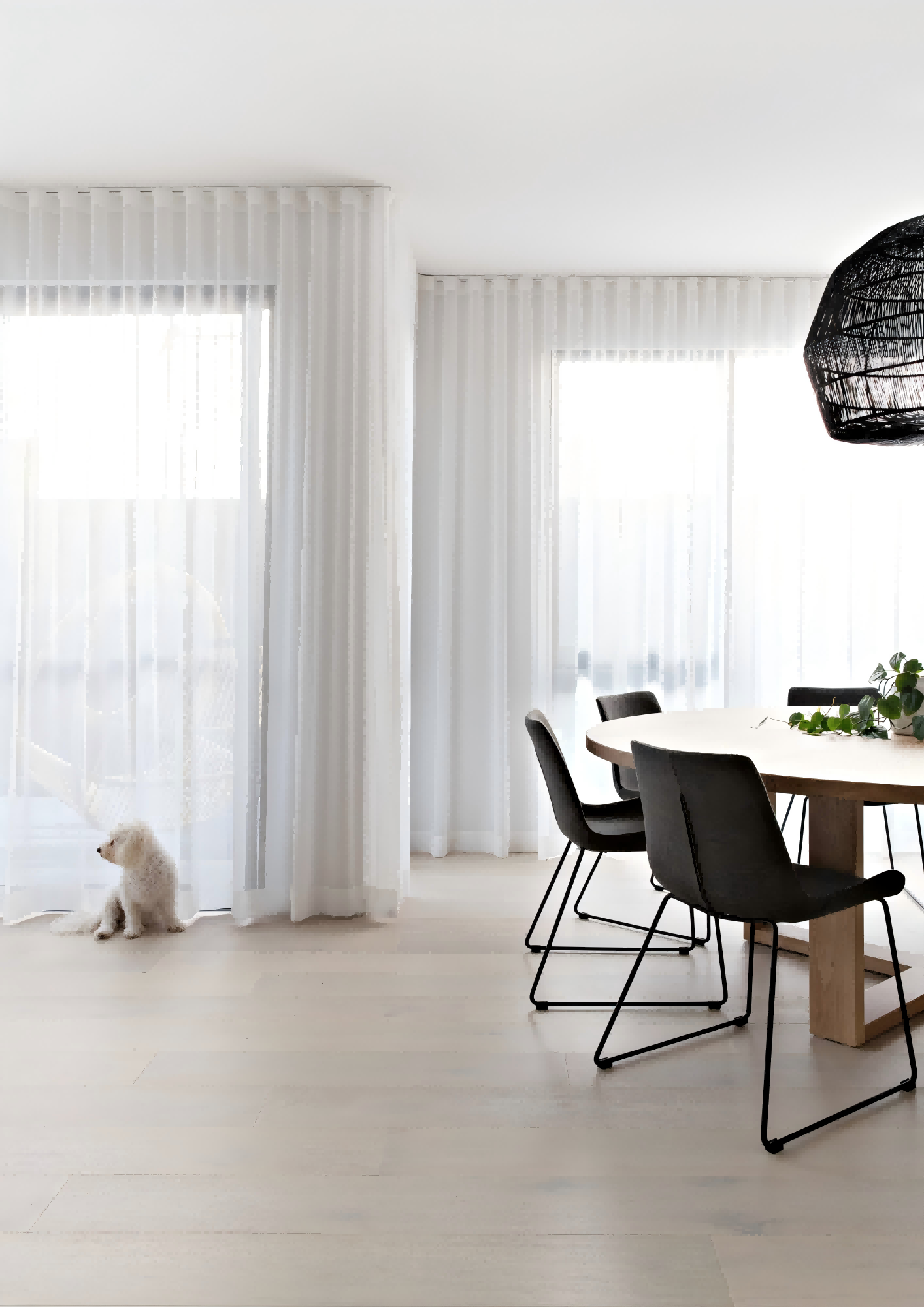 Everything about sheer privacy & daylight, 2× fullness waves, ripplefold/pinch-pleat headers, rods & tracks, smart options, measuring, lead time and care.